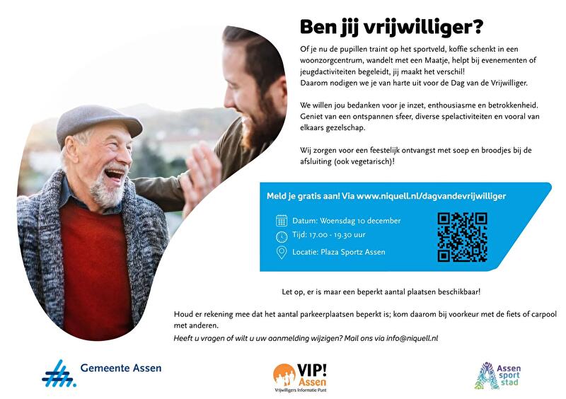 Of je nu koffie schenkt, wandelt met een maatje of helpt bij evenementen, jij als vrijwilliger maakt het verschil! Op woensdag 10 december organiseren de gemeente Assen, Assen Sportstad en VIP! Assen samen de Dag van de Vrijwilliger. Het belooft een gezellige en feestelijke avond te worden met leuke spelactiviteiten, gezelligheid en een smakelijke afsluiting met soep en broodjes (ook vegetarisch).